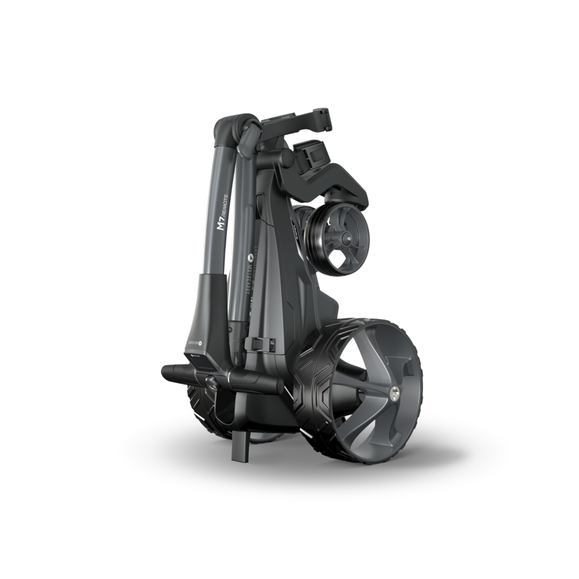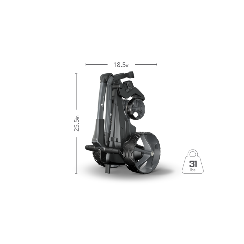 The acclaimed Motocaddy M7 REMOTE electric golf caddy boasts a rechargeable remote with a range exceeding 100 yards and advanced DHC technology for precise maneuverability across varied terrains. Its ergonomic remote offers forward, backward, left, and right controls, with dual modes allowing simple switching to manual handle operation. Powered by twin silent motors and cutting-edge 28V technology, the M7 REMOTE ensures dependable, high-performance course navigation. The 2025 version features a groundbreaking high-capacity CLICK ‘N’ CONNECT® cable-free lithium battery with auto-disconnect and a pop-up charging port. Sporting automotive-inspired design, aerodynamic all-terrain tires, ergonomic grips, an expanded wheelbase, 360° rotating twin front wheels, and a retractable anti-tip rear wheel, it guarantees superior stability and style.
