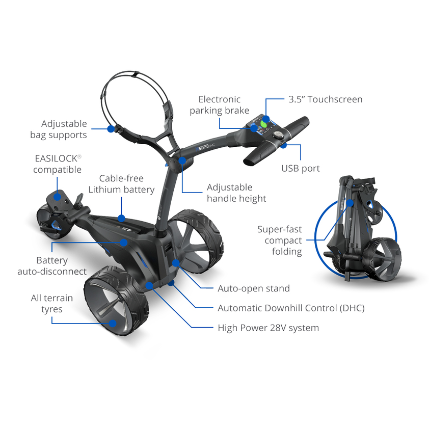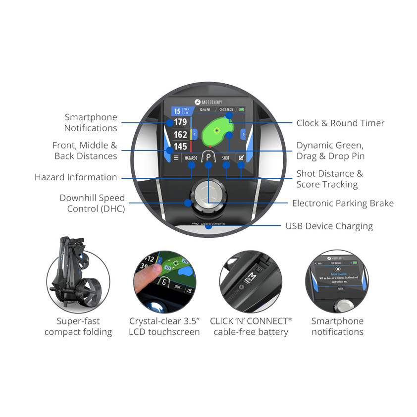 Motocaddy’s acclaimed DHC technology automatically adjusts the trolley’s speed on descents, allowing golfers full hands-free control. Paired with all-terrain tyres and an electronic parking brake, it securely holds the trolley stationary on slopes—both uphill and downhill—while you take your shot. This groundbreaking DHC feature has become indispensable for golfers worldwide, elevating trolley functionality and overall playing experience.